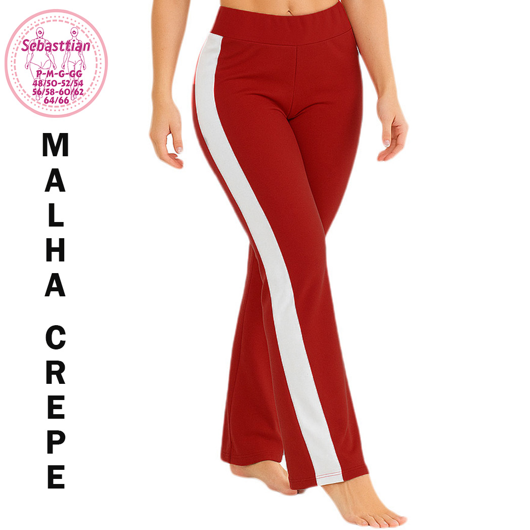 Calça modelo legging flare vermelha com faixa lateral em branco, em tecido malha crepe vermelho e tecido suplex branco, cintura alta.